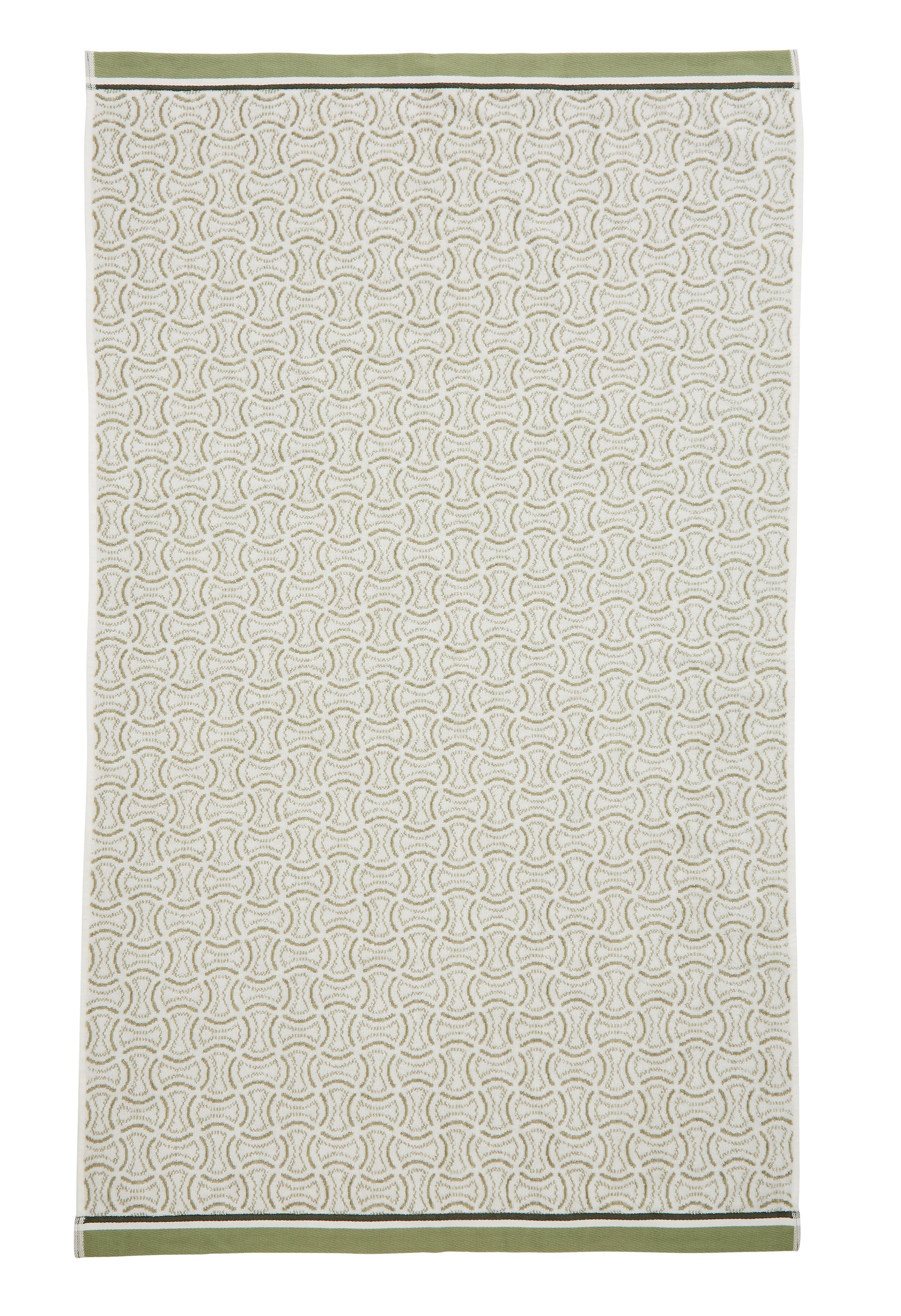 A striking all-over geometric design towel in sage green and white trimmed with a woven hem to the top and bottom. Beautifully soft with a velour front and terry cotton reverse, treated with an anti-piling treatment for long-lasting quality.